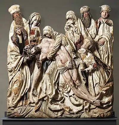 The central Pietà is modelled on the work by a Brussels master from the circle of Rogier van der Weyden (1448).[4][5] The diagonal of Christ's body with its hanging arms and the head of Mary Magdalene form a triangular composition. The diagonals of the main characters (Mary Magdalene, Christ and John) with their slender limbs form an X-shape in the centre of the relief along with another triangle whose top is formed by Joseph of Arimathaea's head.[6]