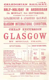 Opened Ardrossan to Barrmill (on the GB&KJR Beith branch) 4 September 1888; Giffen Junction to Cathcart opened for goods trains 1 April 1903 and to passenger trains 1 May 1903; Cathcart to Newton was opened 6 January 1904. After the Giffen Junction to Cathcart section was opened, the short section of the original main line from Giffen Junction to Barrmill Junction ceased to have a passenger service and was only used for occasional goods transfer purposes.[5] Local passenger trains between Uplawmoor and Ardrossan were withdrawn from 4 July 1932 and stations Lugton to Saltcoats closed. However In 1933 the LMS introduced its "Evening Breathers" excursions in the summer of 1933. These offered a return journey from Glasgow to Stevenston, Saltcoats or Ardrossan for half the single fare; the stations were specially made available for the excursions; they proved extremely popular and were repeated in 1934.