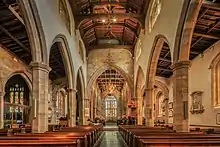 The carved choirstalls are of oak and, dating from 1340, are the third oldest in England. Pevsner states that they are "about the most luxuriant canopies in the country".[5] The seats have misericords, some of which have carvings. At the back of the stalls are modern embroidery panels.[15] The carved pulpit dates from 1619. It was originally a three-decker pulpit with a canopy surmounted by a crown on a Bible. In 1999 the canopy was reinstated, using the original crown.[16] The stone base of the font was installed in 1848 and its carved wooden cover is dated 1631.[17] The three brass chandeliers are dated 1717. The stained glass in the east window was designed by Edward Paley and made by Wailes.[5] The church plate includes four flagons, a chalice and two breadholders dated 1678–79, a small chalice presented in 1728 and a cup dated 1757.[5]