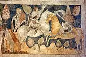 Lancelot's initial knight-errant style adventures from the Vulgate Cycle that have been included in Malory's compilation range from proving victorious in a tournament fighting on behalf of King Bagdemagus, slaying the mighty villain Turquine, who had been holding several of Arthur's knights prisoner, to overcoming a damsel's betrayal and defending himself unarmed against her husband Phelot. In the adventures exclusive to the Vulgate Lancelot, his further great deeds include slaying multiple dragons and giants. He also plays a decisive role in the war against the Saxons in Lothian (Scotland), when he again rescues Arthur and Gawain (as he does on different occasions) and forces the Saxon witch-princess Camille to surrender. Lancelot dedicates his deeds to his lady Guinevere, acting in her name as her knight. At one point, he goes mad when he is led to believe that Guinevere doubts his love until he is found and healed by the Lady of the Lake.[32] Another instance of Lancelot temporarily losing his mind occurs during his brief imprisonment by Camille, after which he is cured by the Lady as well. The motif of his recurring fits of madness (especially "in presence of sexually charged women"[33]) and suicidal tendencies (usually relating to the false or real news of the death of either Gawain or Galehaut) return often throughout the Vulgate and sometimes in other versions as well. He also may harbor a darker, more violent side that is usually suppressed by the chivalric code but can become easily unleashed during the moments of action.[34] Nevertheless, the Vulgate Lancelot notes that "for all the knights in the world he was the one most unwilling to hurt any lady or maiden."