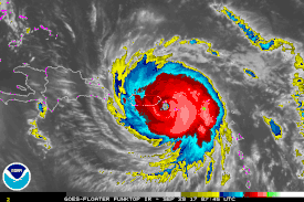 A tropical cyclone is classified as making landfall when the center of the storm moves across the coast; in strong tropical cyclones this is when the eye moves over land.[2] This is where most of the damage occurs within a mature tropical cyclone, such as a typhoon or hurricane, as most of the damaging aspects of these systems are concentrated near the eyewall. Such effects include the peaking of the storm surge, the core of strong winds coming ashore, and heavy flooding rains. These coupled with high surf can cause major beach erosion. When a tropical cyclone makes landfall, the eye usually closes in upon itself due to negative environmental factors over land, such as friction with the terrain , which causes surf to decrease. Maximum sustained winds will naturally decrease as the cyclone moves inland due to frictional differences between water and land with the free atmosphere.[3]
