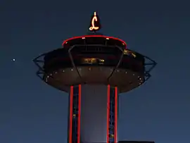 The Landmark[lower-alpha 1] was a hotel and casino located in Paradise, Nevada, east of the Las Vegas Strip and across from the Las Vegas Convention Center. The resort included a 31-floor tower, inspired by the design of the Space Needle tower in Seattle. Frank Caroll, the project's original owner, purchased the property in 1961. Fremont Construction began work on the tower that September, while Caroll opened the adjacent Landmark Plaza shopping center and Landmark Apartments by the end of the year. The tower's completion was expected for early 1963, but because of a lack of financing, construction was stopped in 1962, with the resort approximately 80 percent complete. Up to 1969, the topped-off tower was the tallest building in Nevada until the completion of the International Hotel across the street.