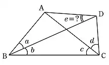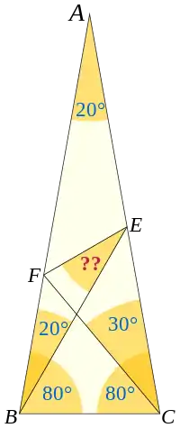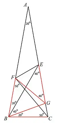 A solution was developed by James Mercer in 1923.[2] This solution involves drawing one additional line, and then making repeated use of the fact that the internal angles of a triangle add up to 180° to prove that several triangles drawn within the large triangle are all isosceles.