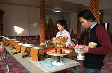 The cuisine of Laos is similar to other regional cuisines such as Thai and Cambodian cuisines, but has several unique distinguishing traits. Lao cuisine's most famous dishes are larb and green Papaya salad, both originated in Laos.[41] The cuisines of the Lao in Laos and Isan have diverged only minutely, with the key differences is that Lao cuisine lacks the influences of Thai cuisine and Isan cuisine lacks many of the French influences in Laos. Rice is the staple, and the main variety is glutinous rice or khao nio (ເຂົ້າຫນຽວ, ข้าวเหนียว, [kʰàw nǐw]), which is also a feature on Isan and Northern Thai tables since both have been influenced by Lao cuisine. Although sometimes replaced by noodles or other, less popular varieties of rice, it is commonly served with an accompaniment of various dips and sauces, raw vegetables, and several dishes that are shared together. Many dishes are very spicy, fiered by the numerous varieties of chili peppers and made pungent by the strong herbs and fermented fish sauces.[42]