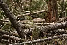 Large woody debris (LWD) are the logs, sticks, branches, and other wood that falls into streams and rivers. This debris can influence the flow and the shape of the stream channel. Large woody debris, grains, and the shape of the bed of the stream are the three main providers of flow resistance, and are thus, a major influence on the shape of the stream channel.[1] Some stream channels have less LWD than they would naturally because of removal by watershed managers for flood control and aesthetic reasons.[2]