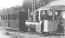 The three locomotives were of the 0-3-0 type, constructed by the Hunslet Engine Company.[5] They were specially built with two boilers to balance on the track, and consequently two fireboxes, one of which had to be stoked by the driver. They were also fitted with powered tenders for auxiliary use on hills. The tender wheels were driven by two cylinders via spur gears. Two small chimneys were fitted to each tender to discharge the exhaust steam from these cylinders. A smaller engine, nicknamed the "coffee pot", was used in the construction of the railway, having been used previously on a demonstration line at Tothill Fields in London. It can be seen on an early photo of 1888.