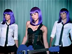 The music video for "Las de la Intuición" was filmed in Miami, Florida, under the direction of Shakira and Spanish photographer Jaume de Laiguana.[11][70] The concept of the clip was developed by the singer, who was inspired by the work of German-Australian photographer Helmut Newton.[11][71] Before its release, her publicists announced that she would appear with a new look, stating that, "Shakira has appeared with brown, red, straight and curly hair, but she has never been seen with a look like this."[72] The video depicts Shakira wearing a purple wig, garter belts and high heels while performing and dancing to the track in different outfits, such as a black corset, miniskirts, and a school-girl uniform.[67][73][74] In the first verse, the singer is looking at a mirror while applying perfurme and lipstick. During the next verse, she holds a guitar and performs a choreography alongside four dancers dressed similarly to her. Later, they keep on dancing while showing in some occasions their underwear. By the end of the clip, she appears leaning against a layer of plastic and performing the track with a microphone.[75] It premiered worldwide on 7 May 2007,[72] and was released on the iTunes Store seven days later.[76] It was also included as a bonus clip on Shakira's third live album Oral Fixation Tour (2007).[77] Both the guitar and wig Shakira used in the music video were sold at auction in 2008 for US$3301.50, in benefit of the singer's Barefoot Foundation.[78]