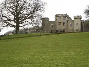 In the mid 17th century, the Lasborough manor was made up of two farms which were worked by tenant farmers, that of Lasborough Park and also Bowldown Farm.[3] Lasborough Farm had an old manor-house. The country house Lasborough Park was built in 1794 for Edmund Estcourt by James Wyatt in Tudor Gothic style.[2] In the early 1870s, Lasborough Park was owned by Robert Stayner Holford of Westonbirt House.[4] The house was enlarged and altered in the 19th century. It was later purchased by Galbraith Cole. In 1929, the house was purchased by Maj. R. A. Scott who held it until 1950. It passed to a timber merchant firm in 1952 who cut down trees on the property. In 1954, it was purchased by W. Curtis and the old manor-house was sold off.[5]
