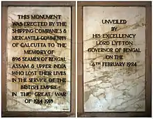 The Lascar War Memorial was erected by shipping and mercantile companies, in the memory of the 896 Lascars of undivided Bengal and Assam who lost their lives during World War I.[5] The monument is situated at the southern end of the Maidan, on Naiper Road, Hastings, near Prinsep Ghat. The 100 feet high monument was unveiled by Lord Lytton, then Governor of Bengal on 6 February 1924. The monument, built in typical Oriental style, is a four-sided column, having designs reflecting the prow of an ancient galley on each side of the column. The upper part of the monument consists of four small minarets and a large gilt dome. A typical Indian look has been given by adding wavy lines beneath the projected balcony, which symbolises waves, along with chhajjas and trellises.[3] The Lascar War Memorial has similarities with the victory tower of Chittor.[1] The memorial built in the Indo-Mughal style by William Ingram Keir, who also designed the Kidderpore Bridge, buildings at Bengal Engineering and Science University in Shibpur, the Indian Institute of Technology, Kharagpur, and Islamia College, and also replaced the 1934 earthquake affected spire of St. Paul's Cathedral, Kolkata with a tower. William Ingram Keir won a prize of Rupees 500 for designing the memorial.[2] The inside of the Memorial is approached through a huge doorway on the Northern wall. The interior contains three plaques below the inscription "Lascar Memorial." One plaque commemorates the unveiling of the memorial by Lytton. The second plaques says that the memorial was erected by shipping and mercantile community of India in memory of the 896 seamen of Bengal Assam and upper India (the term Lascar is not used) who lost their lives in service of the British Empire in the great war of 1914 – 18. The third smaller plaques tells about the renovation and lighting of the Lascar War Memorial.