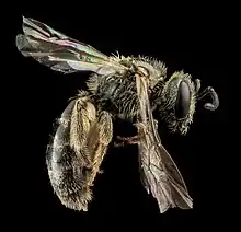 The Gotham bee has a greenish-blue body and brown legs and antennae. Females are 6.1 to 7.1 millimetres (0.24 to 0.28 in) long, about the size of a sesame seed. Males are smaller than females, about 5.26 millimetres (0.207 in) long. The Gotham bee has a wide head (1.73 to 1.87 millimetres (0.068 to 0.074 in) wide versus 1.66 to 1.78 millimetres (0.065 to 0.070 in) long). Males are bluer in color than females which are more green.[1] The Gotham bee can be distinguished from other sweat bees from the pattern of bristles on its abdomen.[2] It most closely resembles Lasioglossum zephyrus and Lasioglossum smilacinae.[1]