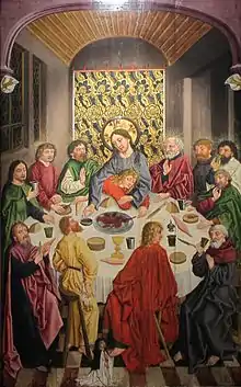 The Last Supper of Jesus and the Twelve Apostles has been a popular subject in Christian art,[1] often as part of a cycle showing the Life of Christ. Depictions of the Last Supper in Christian art date back to early Christianity and can be seen in the Catacombs of Rome.[2][3]
