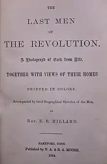 The book The Last Men of the Revolution (1864), compiled by Rev. E. B. Hillard and published by N. A. & R. A. Moore, claimed to include photos and biographies of six of the last surviving Revolutionary War veterans. None of the men interviewed in the book would become the last surviving Revolutionary War veteran but the photos published in the book are some of the few surviving photos of American Revolutionary War veterans.[7]