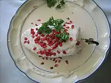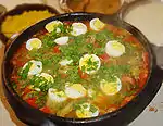 Haitian cuisine is a mixture of various cuisines, predominately of a similar nature with fellow Latin American countries. In addition to native Taino cooking, French and Spanish colonization in concordance with the introduction of African slaves heavily influenced the culinary practices of Haiti. For example, a staple food of major Haitian cities (e.g. Port-au-Prince) is French baguettes. The French and Spanish brought Roman Catholicism along with them, so the Haitian food calendar follows that of the Catholic tradition. For example, soup joumou (also known as giraumon soup) is served on New Year's Day. Joumou is a pumpkin soup made with salt beef and seasoned with nutmeg and other spices.[3] Haitians eat traditional foods (e.g. benye, white beans, kremas) in excess on feast days. Poorer areas, which were more impacted by the immigration of Syrians and the Lebanese in the 19th century, popularized Pain Haitien. Slaves created various popular Haitian dishes such as pain patate, akra de mori, and thiaka. Other staple foods are rice (diri), other grains, and millet (piti mii) for the poor. All of these foods are usually in every meal along with beans. Poultry is far more popular than pork or meat; however, the majority of the protein provided in a Haitian diet is from rice and beans. Some foods are regional staples. Seafood, while popular everywhere, has a heavy cultural influence on coast towns. Fruits and nuts from the mountains of Haiti are exported across that region of the island, providing Haitians with delicious and healthy drinks and desserts.[2] Though similar to other cuisine in the region, it carries a uniqueness native only to the country and an appeal to many visitors in the island.