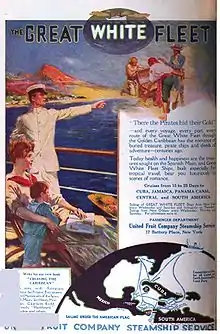 The United States was in an advantageous position to expand trade with Latin America, with already strong ties with Mexico, Central America, and the Caribbean. With the opening of the Panama Canal in 1914 and the disruption of the transatlantic trade, U.S. exports to Latin America increased.[104] As transportation in the Caribbean became cheaper and more available, fragile tropical imports, especially bananas could be reach mass markets in the United States. U.S. Navy ships deemed surplus following the Spanish–American War (1898) were made available to the United Fruit Company, which created its "Great White Fleet." Latin American countries dominated by U.S. interests were dubbed banana republics.