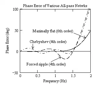 As an example, consider the performance of a sixth order maximally flat delay network with two fourth order networks, one with Chebyshev ripple, and one using the power series approximation. The figure below compares the phase error plots of these three networks (the full line is for the maximally flat response, the dot-dash line for the Chebyshev response and the dashed line for the power series approximation).