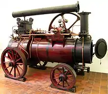 This boiler design was used for semi-portable engines from the 1860s. As the wider grate allowed the burning of poor fuels, such as straw or sugarcane waste, it was favoured for agricultural use and was widely known as the 'colonial' type. Marshalls built many of these and patented the design as their 'Britannia' firebox.[4] This was also offered in a lengthened form as a log-burning furnace, particularly for use in Australia and Africa where forest land was being clear-felled for agriculture.[5]