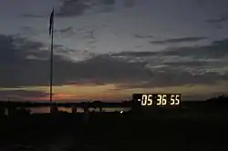 ![]() The flagpole and countdown clock at dawn before the STS-114 launch in July 2005 | |