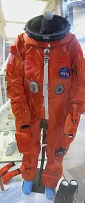 The Launch Entry Suit (LES), known as the "pumpkin suit", is a partial-pressure suit that was worn by all Space Shuttle crews for the ascent and entry portions of flight from STS-26 (1988) to STS-65 (1994). It was completely phased out by STS-88 (late 1998)[1][2] and replaced by the ACES suit. The suit was manufactured by the David Clark Company of Worcester, Massachusetts.