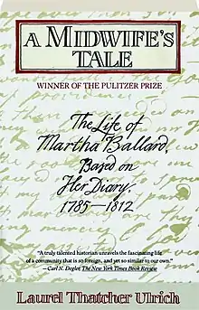 A Midwife's Tale examines the life of Northern New England midwife Martha Ballard, and provides a vivid examination of ordinary life in the early American republic, including the role of women in the household and local market economy, the nature of marriage and sexual relations, aspects of medical practice, and the prevalence of violence and crime. In this book, Ulrich effectively and simultaneously builds historical knowledge of the colonial world and Martha Ballard's biography.[13]