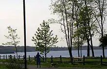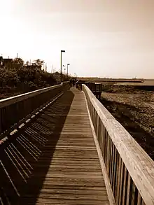 Laurence Harbor is home to Old Bridge Waterfront Park, which consists of a new boardwalk (the old boardwalk was destroyed in the 1940–1950s) that was completed in 2002. The beachfront was redone through a joint venture by Old Bridge Township, New Jersey and Middlesex County Parks Department. It extends approximately one mile from the Old Bridge Police substation south, to the Aberdeen Township neighborhood of Cliffwood Beach, and runs parallel with New Jersey Route 35. This area is very popular for fishing as three jetties extend into Raritan Bay and are in excellent condition, also recently redone in the past ten years. The park's boardwalk is also popular for jogging and dog walking. At the northern parking lot of the park, there is bay beach swimming access along with a bathroom and showers.