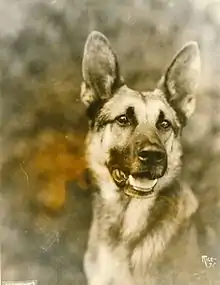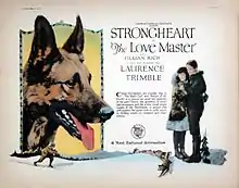 Knowing what qualities a dog needs to be a success in motion pictures—particularly the ability to register feelings that actual conditions do not warrant—Trimble set out to select a German Shepherd dog for his next canine actor. After extensive research he narrowed the field to three specific dogs, one of them in Germany and two in the U.S.[15] In the autumn of 1920, Trimble found a dog at a kennel in White Plains, New York.[16][17] Etzel von Oeringen was a male German Shepherd born in 1917.[18] He was trained in Berlin as a police dog and served in the German Red Cross during World War I.[19] At age three the dog was brought to the United States to be sold. Trimble recognized Etzel's potential and persuaded Jane Murfin, a screenwriter for his films, to buy the dog.[20] A new name, Strongheart, was suggested by the publicity department of First National Pictures, which released his first film.[21]