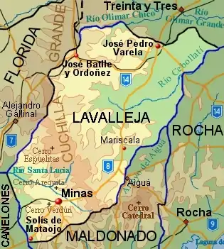 Lavalleja (Spanish pronunciation: [laβaˈʝexa]) is a department of Uruguay. Its capital is Minas. It is located in the southeast of the country, bordered to the north by the department of Treinta y Tres to the east with Rocha, to the south with Canelones and Maldonado, and to the west to Florida.