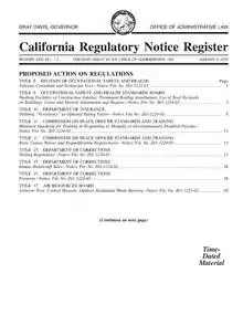 Pursuant to certain broadly worded statutes, state agencies have promulgated an enormous body of regulations, which are codified in the California Code of Regulations (CCR) and carry the force of law to the extent they do not conflict with any statutes or the state or federal Constitutions. Pursuant to the California Administrative Procedure Act, a "Notice of Proposed Action" is published in the California Regulatory Notice Register (Notice Register) and at least 45 days are required for public hearings and comment before being reviewed and approved by the California Office of Administrative Law (OAL) and codified in the CCR.[1]