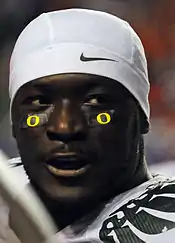 The Ducks opened their 2009 season with a 19–8 loss to the Boise State Broncos.[31] Blount ended the game with negative yardage (−5) on eight carries.[32] Blount had been interviewed by a Sports Illustrated reporter earlier in the summer and was asked about the excessive late hits in the 2008 game in Eugene between Oregon and Boise State. He had been quoted that because of the way Boise State beat Oregon in Eugene, they, "owed them an ass-whoopin'." In the 2008 game, Oregon quarterback Jeremiah Masoli was forced to leave the game after taking a helmet to the chin on a late hit by a Boise State defender. Oregon lost that game, but the late hits were a topic of discussion as the teams prepared for the season opener against each other. Shortly after the game's end, Boise State defensive player Byron Hout came up to Blount, slapped Blount's shoulder pad and said, "How's that for an ass-whoopin'?" Blount sucker punched Hout,[33][34][35][36] knocking him to the ground.[37][38][39] Blount then hit teammate Garrett Embry, who was attempting to restrain him, in the helmet.[40]