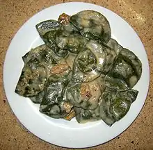 Preboggion, a mixture of different wild boiled greens, is used in Ligurian cuisine to stuff ravioli and pansoti.[7] One of the main ingredients of preboggion are borage (Borago officinalis) leaves. Preboggion is also sometimes added to minestrone soup and frittata.[8]