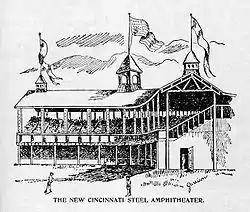 After a season and a half of playing in the charred ballpark, the Reds built what they expected to be a more permanent new grandstand, again in the southwest corner, retaining the original seating, and again with a gap between the seating areas that would prove fortuitous. The original seating had changed somewhat over time, as the middle section no longer sat higher than the rest, and the entire structure was roofed.