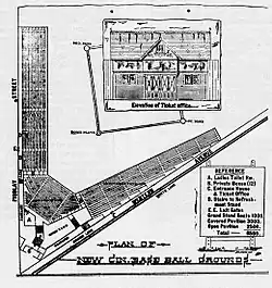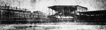 The new facility was variously called Cincinnati Base Ball Grounds (or Park), Western Avenue Grounds, American Park (while in the AA), and then its most enduring pre-1912 name, League Park (beginning 1890). The small grandstand for the new park was built in the southeast corner of the block, tucked into the acute angle made by the intersection. Although the diamond would be moved back and forth between the southeast and the southwest corners several times, the little 1884 structure would be retained for 28 seasons, and would come in handy. However, it got off to a bad start. It was constructed hastily, and during the opening day game a portion of the stand collapsed, killing one spectator and injuring several others.