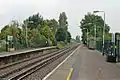 A view, towards Bidston, of the platforms, footbridge and level crossing.
