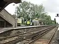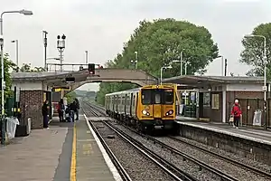 Through electric services to Liverpool Central commenced on 13 March 1938, when the LMS electrified the lines from Birkenhead Park to West Kirby.[5][6] The service was provided by the then-new LMS electric multiple units. However, on Sunday mornings, the service was provided by the older Mersey Railway electric units, which had until then only run from Liverpool to Birkenhead Park.[7] The platform buildings were replaced in 1938, rebuilt in a similar style to those along the line towards West Kirby,[8] and a footbridge was added. The signal box, used to operate the level crossing and replacing a cabin on the westbound platform, was moved to the opposite side of Reeds Lane and was also improved at the time.[9]