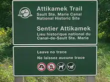"Leave no trace" sign on the Attikamek Trail near Sault Ste. Marie Canal in Canada.