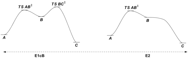 This dramatic departure from normal leaving group requirements occurs mostly in the realm of C=O double bond formation where formation of the very strong C=O double bond can drive otherwise unfavorable reactions forward. The requirement for a good leaving group is still relaxed in the case of C=C bond formation via E1cB mechanisms, but because of the relative weakness of the C=C double bond, the reaction still exhibits some leaving group sensitivity. Notably, changing the leaving group's identity (and willingness to leave) can change the nature of the mechanism in elimination reactions. With poor leaving groups, the E1cB mechanism is favored, but as the leaving group's ability changes, the reaction shifts from having a rate determining loss of leaving group from carbanionic intermediate B via TS BC‡ through having a rate determining deprotonation step via TS AB‡ (not pictured) to a concerted E2 elimination. In the latter situation, the leaving group X has become good enough that the former transition state connecting intermediates B and C has become lower in energy than B, which is no longer a stationary point on the potential energy surface for the reaction. Because only one transition state connects starting material A and product C, the reaction is now concerted (albeit very asynchronous in the pictured case) due to the increase in leaving group ability of X.
