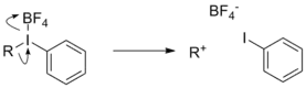 6[7][8] and CHB11Cl11−.[9] The strongly electrophilic nature of these compounds engendered by their attachment to extremely labile R-X (R = alkyl, X = Cl, Br, I) leaving groups is illustrated by their propensity to alkylate very weak nucleophiles. Heating neat samples of (CH3)2Cl+ [CHB11Cl11]− under reduced pressure resulted in methylation of the very poorly nucleophilic carborane anion with concomitant expulsion of the CH3Cl leaving group. Dialkyl halonium hexafluoroantimonate salts alkylate excess alkyl halides to give exchanged products. Their strongly electrophilic nature, along with the instability of primary carbocations generated from ionization of their alkyl groups, points to their possible involvement in Friedel-Crafts alkylation chemistry.[7] The order of increasing lability of these leaving groups is R-I < R-Br < R-Cl.