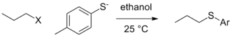 There can still exist contextual differences in leaving group ability in the purest form, that is when the actual group that leaves is not affected by the reaction conditions (by protonation or Lewis acid complexation) and the departure of the leaving group occurs in the rate determining step. In the situation where other variables are held constant (nature of the alkyl electrophile, solvent, etc.), a change in nucleophile can lead to a change in the order of reactivity for leaving groups. In the case below, tosylate is the best leaving group when ethoxide is the nucleophile, but iodide and even bromide become better leaving groups in the case of the thiolate nucleophile.[5]