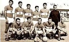 During the early-1950s, Lebanon were coached by Vinzenz Dittrich and Ljubiša Broćić.[18][19] The side played four official games between 1953 and 1956, most notably hosting Hungary in 1956.[13] Lebanon lost the match 4–1, with Hungary's Ferenc Puskás scoring two goals.[12] The team also played unofficial games against top-level European clubs such as Dynamo Moscow, Leipzig, and Spartak Trnava in 1957.[12] Lebanon played Energia Flacăra Ploiești the same year in the opening game of the Sports City Stadium.[20] The match ended in 1–0 win for Lebanon thanks to a Joseph Abou Murad goal.[20]