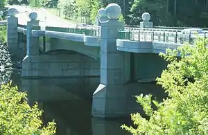 The bridge now standing was built between 1998 and 2000 by the New Hampshire Department of Transportation.[3] At each end it displays a pair of "bridge balls," the controversial Classical ornaments cast in concrete that refer to the gateway to Tuck Drive nearby on the Hanover shore. They are the product of a Concord architect brought in by NHDOT to infuse some extra aesthetic appeal into the design of the bridge.