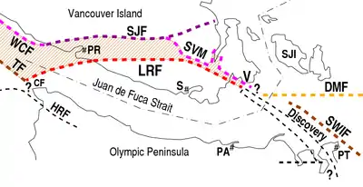 The Leech River Fault (LRF) is a key element in understanding regional tectonic history as it and the San Juan Fault mark a change from the relatively simply subduction zone structure to the northwest, to the complex structures of the San Juan Islands and the Puget Lowland to the east and southeast. The straightness of its surface trace suggests the LRF has been a strike-slip fault.[8] In these respects the LRF is very similar to the Devils Mountain Fault, which can be traced due west from near Mount Vernon to a point just south of Victoria.[9]