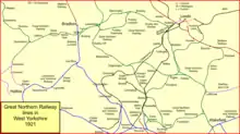 The LB&HJR arranged for the Great Northern Railway to work its line. This enabled the GNR to incorporate through running to Halifax into its own network.[7] The Lancashire and Yorkshire Railway also had running powers over the LB&HJR, and used these for through expresses.[6] The LB&HJR line passed Bradford at some distance, and in the following Parliamentary session the LB&HJR obtained authorisation for a branch line to an independent Bradford terminus, from a junction on its own line at Laister Dyke; also authorised was a colliery branch to Gildersome. The relevant Act was passed on 4 August 1853. The Bradford terminus became known as Adolphus Street.[5][7]