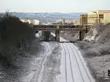 Leeds to Bradford Railway Line looking west towards Bradford. The bridge is Planetrees Road and the sidings on the left are for the scrapyard.