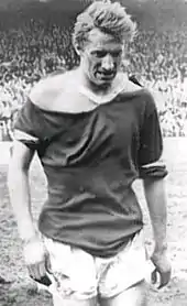 During the 1964–65 season, the two sides were drawn against each other in the semi-finals of the FA Cup for a chance to reach the final. The tie at Hillsborough was a very rough game – the image of Jack Charlton and Denis Law punching each other and wrestling on the ground epitomised the spirit in which the game was played – and it ended 0–0, with the Yorkshire Post commenting "both sides behaved like a pack of dogs snapping and snarling at each other over a bone".[19] The replay at the City Ground was tense and it took 89 minutes for Bremner to fire in the winner for Leeds.[19] The two clubs finished 1st and 2nd in the league that same season, both on 61 points, but the Mancunians won the title due to a better goal average.[20]