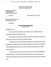 On January 28, 2017, U.S. District Judge Leonie Brinkema issued a temporary restraining order enjoining President Donald Trump and the other respondents from enforcing of parts of Trump's executive order. The Court stated in its order that Customs officials "... shall permit lawyers access to all legal permanent residents being detained at Dulles International Airport ..." and that Customs officers "... are forbidden from removing plaintiffs ... lawful permanent residents at Dulles International Airport for a period of 7 days from the issuance of this Order." The court has neither let the affected people into the country nor ruled on the constitutionality of the order itself in its ruling.[84][85] Subsequently, the restraining order has been extended until February 10, 2017.[86]