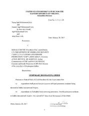 | Mohammed v. United States | Central District of California | A temporary restraining order enjoining the Executive Order was entered January 31, 2017. The Court subsequently set the matter for Preliminary Injunction hearing on February 10, 2017.[54][55] |