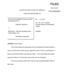 On February 16, the Trump administration asked for a delay in further proceedings because they expected to replace the executive order with a new one the following week.[66] On February 16, 2017, the 9th Circuit issued an order staying the en-banc review of its previous ruling based on the United States Supplemental Brief promising a new executive order.[67]
