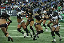 Some players responded ambivalently or positively to the uniforms, with one quoted as saying "I just appreciate playing football, I don't care what they put me in", and another favoring the limited clothing, saying "It's more comfortable this way."[30] LFL players with experience in track and field competitions noted that the typical LFL uniform is comparable to other uniforms, with Elizabeth Govrick of the Minnesota Valkyrie stating she "ran track and I was wearing, you know, stuff if not close to almost smaller than what I'm wearing out on the football field. You take beach volleyball, you take volleyball, you take other sports where it's pretty much the same thing."[31] Adrian Purnell of the Jacksonville Breeze said that the outfits were only for marketing purposes.[32] Heather Furr, a quarterback for the Chicago Bliss said "I think with little girls watching the game ... if they can see past the uniform and see us as role models, then that's what I want."[29] Abbie Sullivan of the Cleveland Crush stated, "just because we play in the LFL does not mean we promote promiscuity. We are smart females. We are athletes who take care of our bodies. We are the total package." Similarly, Toledo Crush player Marija Condric stated, "Everyone is entitled to their own opinion. Sit down and watch. You’ll forget what we are wearing and you will be thinking about how hard that girl got hit on that last play."[33]