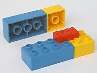Lego Duplo (trademarked as DUPLO and stylized in the logo as duplo) is a product range of the construction toy Lego by The LEGO Group, designed for children from 1 1⁄2 to 5 years old. Duplo bricks are twice the length, height, and width of traditional Lego bricks, making them easier to handle and less likely to be swallowed by younger children. Despite their size, they are still compatible with traditional Lego bricks.