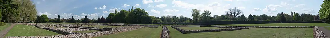 ![]() Low walls laid out on the general plan of Leicester Abbey, which was established during excavations in the 1920s and 1930s. | |