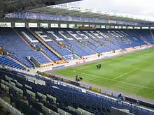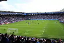 The club moved away from Filbert Street in 2002 to a new 32,500 all-seater stadium.[100] The stadium was originally named The Walkers Stadium in a deal with food manufacturers Walkers, whose brand logo can still be found in some areas around the outside of the stadium.[101] The first match hosted at Walkers was a 1–1 friendly draw against Athletic Bilbao, with Bilbao's Tiko being the first scorer at the stadium and Jordan Stewart being the first Leicester player to score.[102] The first competitive match was a 2–0 victory against Watford.[103] The stadium has since hosted an England international against Serbia and Montenegro, which finished 2–1 to England, as well as internationals between Brazil and Jamaica, and Jamaica and Ghana. The stadium has been used to host the Heineken Cup European Rugby semi-finals for the Leicester Tigers rugby club, itself based within a mile of the King Power Stadium.